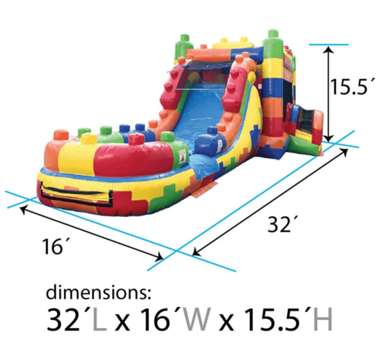 Take the fun and excitement of jumping and playing in a water slide bounce house and MEGA SIZE it with the Mega Building Block Water Slide Bounce House Combo! From their bright, vibrant colors, to the spacious bouncing area and incredibly fun big slide, kids can't help but look at these units in awe. This unit stretches out for 32' feet of fun, exciting activities that may even have a few parents secretly wanting to jump in! Crawl into the bouncing area through our upgraded, enclosed tunnel entrance. Have a blast jumping, bouncing and laughing the day away on this mega bouncer! It even has a basketball hoop inside the bouncing area for extra fun! Climb up the short rock climb wall to get a view of the flowing water down the slide. Get ready, then head down into the splash pool at the bottom for a grand finale and some photos for the scrapbook! The Mega Building Block Water Slide Bounce House Combo brings everything needed to the party to have a great time, and fill it with all the joy that kids (and adults!) want on a fun, exciting and memorable play day.