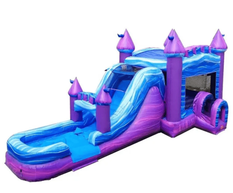 Take the fun and excitement of jumping and playing in a water slide bounce house and MEGA SIZE it with the Mega Purple Water Slide Bounce House Combo! From their bright, vibrant colors, to the spacious bouncing area and incredibly fun big slide, kids can't help but look at these units in awe. This unit stretches out for 32' feet of fun, exciting activities that may even have a few parents secretly wanting to jump in! Crawl into the bouncing area through our upgraded, enclosed tunnel entrance. Have a blast jumping, bouncing and laughing the day away on this mega bouncer! It even has a basketball hoop inside the bouncing area for extra fun! Climb up the short rock climb wall to get a view of the flowing water down the slide. Get ready, then head down into the splash pool at the bottom for a grand finale and some photos for the scrapbook! The Mega Purple Water Slide Bounce House Combo brings everything needed to the party to have a great time, and fill it with all the joy that kids (and adults!) want on a fun, exciting and memorable play day.